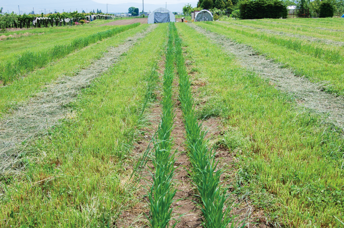 草生栽培は、例えば春では「夏作の畝(育種)」「緑肥(クローバー、ペレニアルグラスの草生)」「秋作の畝」「緑肥」と、圃場の半分は「緑肥」を栽培し、作物の作付け面積は1度の育種時期に全面積の1/4しか使用していません。