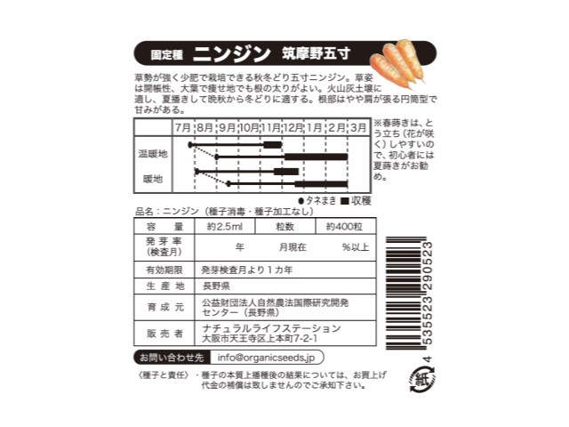 農薬や化学肥料に頼らず、生命を生かし、自然の働きを引き出し、永続的な生産を行うことを目的とした「自然農法」で栽培された筑摩野五寸ニンジンの種子です。
