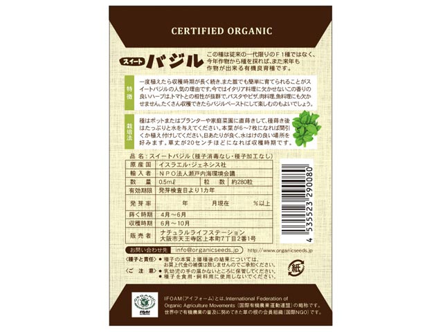 Natural Life Station有機種子スイートバジル0.5ml(約280粒) イスラエル GENESIS SEED社 蒔く時期 4月~9月 収穫時期 5月~10月 開花時期 20℃~25℃ 有機種子 野菜の種 ハーブの種 春夏 秋冬 初心者向け ポット栽培OK イスラエル GENESIS SEED社 Natural Life Station 販売中 返品・交換について ご利用ガイド 商品説明 スイートバジルの特徴 有機認証を得た土壌から育成したスイートバジルより採取した種です。 一度植えたら収穫期が長く続き、また、誰にでも簡単に育てられます。 今ではイタリア料理には欠かせない香りのよいハーブです。 もっと知りたい方へ Recommend 有機種子のススメ How to 育て方をみる 商品仕様 商品コード 29-008 JANコード 4535523290080 メーカー Natural Life Station 商品名 有機種子スイートバジル 内容量 0.5ml(約280粒) 生産国 イスラエル | GENESIS SEED社