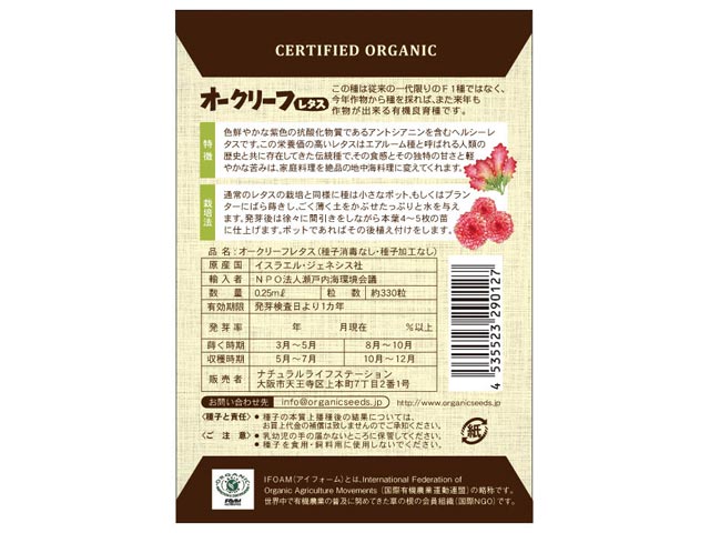 Natural Life Station有機種子オークリーフレタス0.25ml(約330粒) イスラエル GENESIS SEED社 蒔く時期 3月~5月、8月~10月 収穫時期 5月~7月、10月~12月 開花時期 15℃~20℃ 有機種子 野菜の種 春夏 秋冬 イスラエル GENESIS SEED社 Natural Life Station 販売中 返品・交換について ご利用ガイド 商品説明 オークリーフレタスの特徴 有機認証を得た土壌から育成したオークリーフレタスより採取した種です。 色鮮やかな紫色の抗酸化物質であるアントシアニンを含むヘルシーレタスです。 もっと知りたい方へ Recommend 有機種子のススメ How to 育て方をみる 商品仕様 商品コード 29-012 JANコード 4535523290127 メーカー Natural Life Station 商品名 有機種子オークリーフレタス 内容量 0.25ml(約330粒) 生産国 イスラエル | GENESIS SEED社