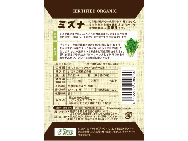 Natural Life Station有機種子ミズナ0.25ml(約150粒) ポルトガル SEMENTES VIVAS社 蒔く時期 2~11月 収穫時期 通年 開花時期 15~20℃ 有機種子 野菜の種 春夏 秋冬 ポルトガル SEMENTES VIVAS社 Natural Life Station 販売中 返品・交換について ご利用ガイド 商品説明 ミズナの特徴 有機認証を得た土壌から育成したミズナより採取した種です。 ミズナは成長が早く、たくさん収穫出来ます。 成長すると放射状に密生し、葉はハート形からギザギザした形に変化します。 もっと知りたい方へ Recommend 有機種子のススメ 商品仕様 商品コード 29-068 JANコード 4535523290684 メーカー Natural Life Station 商品名 有機種子ミズナ 内容量 0.25ml(約150粒) 生産国 ポルトガル | SEMENTES VIVAS社