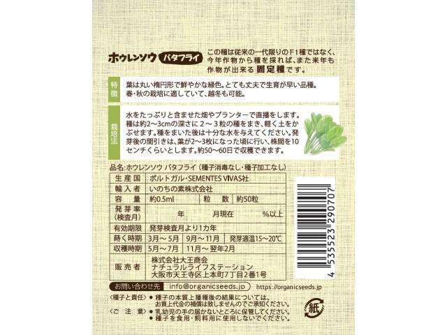 Natural Life Station有機種子ホウレンソウバタフライ0.5ml(約50粒) ポルトガル SEMENTES VIVAS社 蒔く時期 3~5月、9~11月 収穫時期 5~7月、11~2月 開花時期 15~20℃ 有機種子 野菜の種 春夏 秋冬 ポルトガル SEMENTES VIVAS社 Natural Life Station 販売中 返品・交換について ご利用ガイド 商品説明 ホウレンソウバタフライの特徴 有機認証を得た土壌から育成したホウレンソウ バラフライより採取した種です。 葉は丸い楕円形で鮮やかな緑色です。 とても丈夫で生育が早い品種で、春・秋の栽培に適していて越冬も可能です。 もっと知りたい方へ Recommend 有機種子のススメ 商品仕様 商品コード 29-070 JANコード 4535523290707 メーカー Natural Life Station 商品名 有機種子ホウレンソウバタフライ 内容量 0.5ml(約50粒) 生産国 ポルトガル | SEMENTES VIVAS社