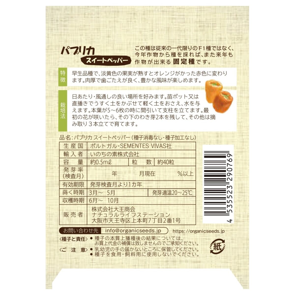 Natural Life Station有機種子パプリカ スイートペッパー0.5ml(約40粒) ポルトガル SEMENTES VIVAS社 蒔く時期 3~5月 発芽適温 20~25℃ 収穫時期 6~10月 有機種子 野菜の種 春夏 深型プランター推奨 ポルトガル SEMENTES VIVAS社 Natural Life Station 販売中 返品・交換について ご利用ガイド 商品説明 パプリカ スイートペッパーの特徴 有機認証を得た土壌から育成したパプリカ(スイートペッパー)より採取した種です。早生品種で、淡黄色の果実が熟すとオレンジがかった赤色に変わります。肉厚で歯ごたえが良く、豊かな風味が楽しめます。 もっと知りたい方へ Recommend 有機種子のススメ 商品仕様 商品コード 29-076 JANコード 4535523290769 メーカー Natural Life Station 商品名 有機種子パプリカ スイートペッパー 内容量 0.5ml(約40粒) 生産国 ポルトガル | SEMENTES VIVAS社 輸入者 いのちの素株式会社